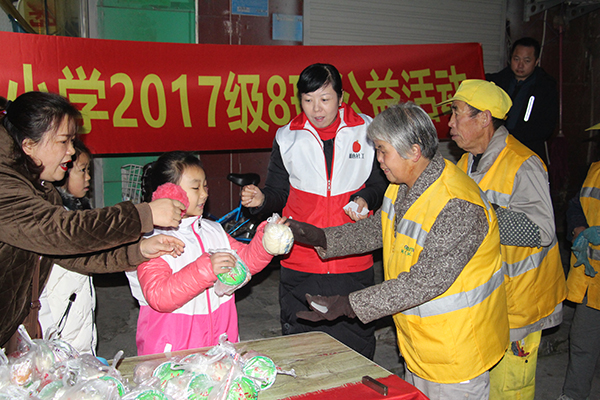 12月1日早上6点半,天还蒙蒙亮,寒意尚浓,八名新乡市外国语小学二八班的小学生在家长的陪伴下来到新乡市人民公园西门附近一家早餐店,紧张的对豆浆、鸡蛋、包子等食物分拣包装,然后轮流分发给排队的环卫工,还会送上一句问候:“爷爷(奶奶)辛苦了!”