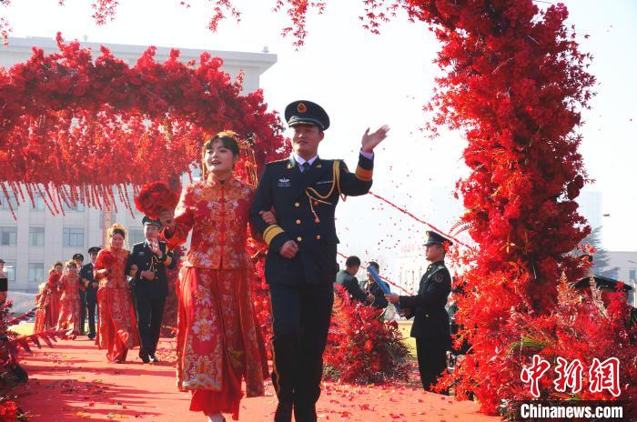 中新网北京11月11日电(记者 韩章云 通讯员 张佳璐)“我终于娶了那个坐高铁追火车给我送充电宝的姑娘,太幸福了。”牵着妻子晋子雅的手,廖子强的声音有些哽咽。11月11日,火箭军某部为116对新人举行隆重而温馨的集体婚礼,结束多年恋爱长跑,在“双十一”光棍节集体脱单,新人们的脸上洋溢着幸福的笑容。