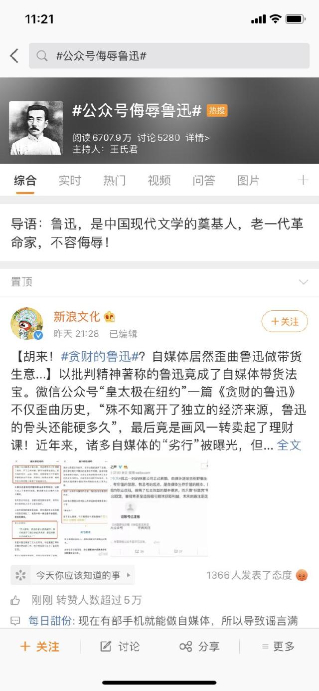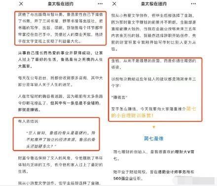 这个上热搜的自媒体公众号名叫“皇太极在纽约”,其在今年7月份发表了一篇《贪财的鲁迅》,文中将鲁迅描述成了一个唯利是图的商人,说鲁迅“凭借过人的商业天赋,在文字变现上实现了利益最大化”“殊不知离开了独立的经济来源,鲁迅的骨头还能硬多久”。