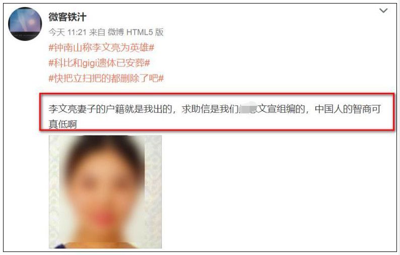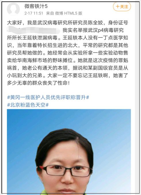 就在今天下午,一个名为@微客铁汁5 的微博账号发帖,宣称自己是中科院武汉病毒所的研究员陈全姣,并称自己要实名举报武汉病毒所的所长王延轶是此次新型冠状病毒疫情的罪魁祸首。