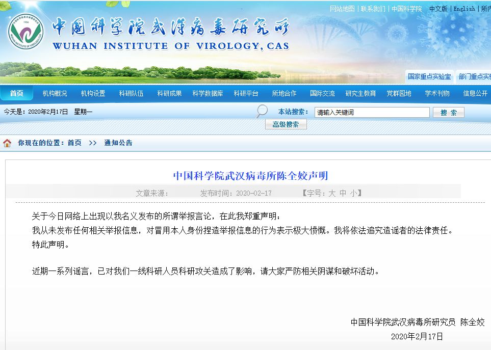 另一方面,武汉病毒所刚刚也在其官网上发布了声明,澄清该所的陈全姣研究员的身份被人盗用。陈全姣还在声明中表示她对冒用其身份捏造举报信息的行为表示“极大愤慨”。