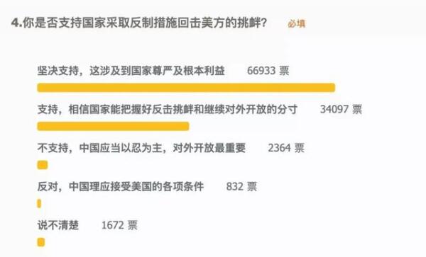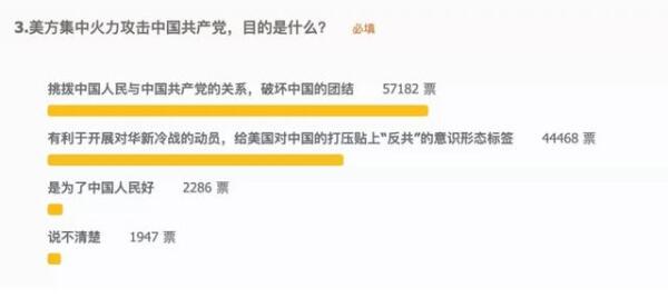 网上投票一般来说没有线下投票的准确率高,偏差率要大于随机的街访、入户调查等。但即使这样,对上述两个回答的选择率也是非常高的,反映了在当前中美斗争大环境下人们对党和政府的支持。华盛顿希望离间中国社会的图谋也不会得逞。
