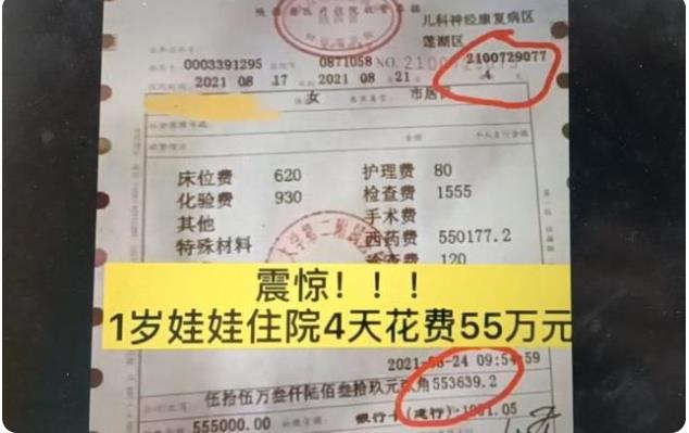 @健康时报9月4日消息,近日,西安交大第二附属医院一张55万元的医院收费票据在网上引来关注。票据显示,一名1岁幼女从今年8月17日开始,住院4天直到8月21日,花费55万元。其中床位费620元,化验费930元,护理费80元,检查费1555元,诊查费120元,西药费550177.2元。