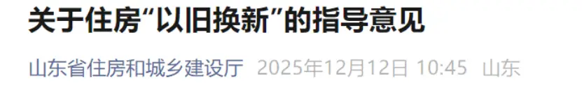 12月12日,山东省发布了《关于住房“以旧换新”的指导意见》,其中提出,丰富“换新”模式,拓宽旧房处置途径,多措并举降低换房成本等。