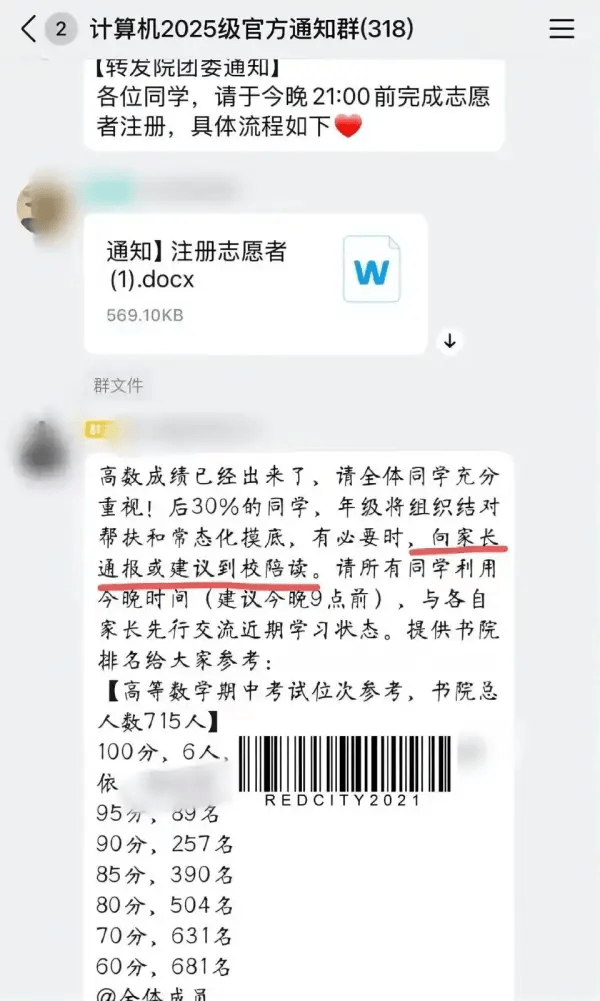 近日,有网友发文称,南京理工大学致知书院计算机2025级官方群内发布通知称,对高数成绩排名后30%的同学,年级将组织结对帮扶与常态化摸底,有必要时,向家长通报或建议到校陪读。
