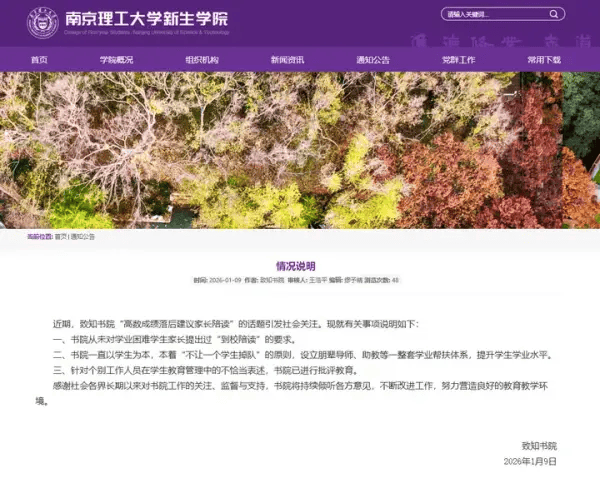 建议高数成绩落后学生家长到校陪读?南京理工大学回应
