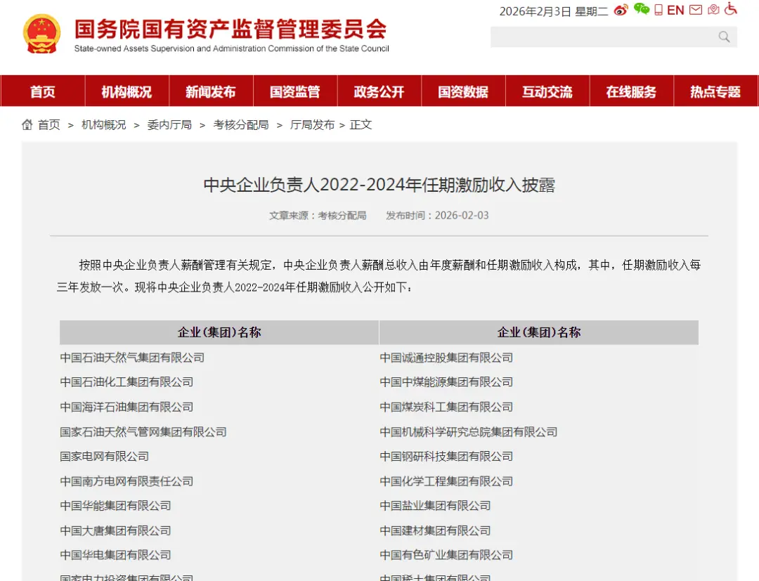 据国务院国资委网站2月3日消息,按照中央企业负责人薪酬管理有关规定,中央企业负责人薪酬总收入由年度薪酬和任期激励收入构成,其中,任期激励收入每三年发放一次。