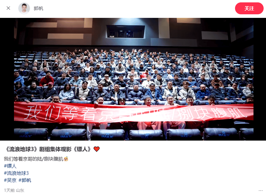 2月17日才开通小红书账号的郭帆,节后开工第一天发的不是“小破球”宣传,而是领着《流浪地球3》全剧组去包场看《镖人》,还拉出趣味横幅 “我们等着京哥的陆/捌块腹肌” 。电影《流浪地球》的官方微博也开足马力,宣传《镖人》。