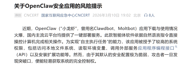 3月10日,国家互联网应急中心通过微信公众号发布《关于OpenClaw安全应用的风险提示》,全文如下: