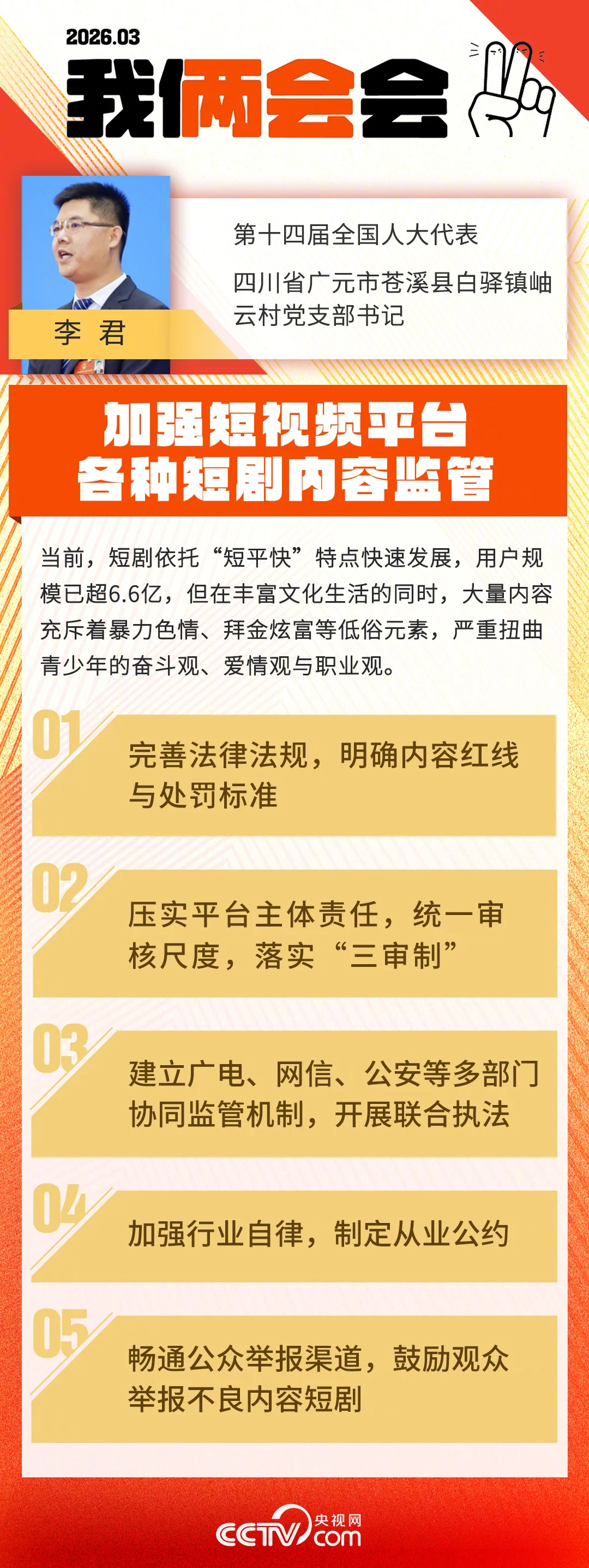 全国人大代表、四川省广元市苍溪县白驿镇岫云村党支部书记李君表示,当前,短剧依托“短平快”特点快速发展,用户规模已超6.6亿,但在丰富文化生活的同时,大量内容充斥着暴力色情、拜金炫富等低俗元素,严重扭曲青少年的奋斗观、爱情观与职业观。乱象根源在于制作门槛低、平台审核标准不一及监管法规细则缺失。