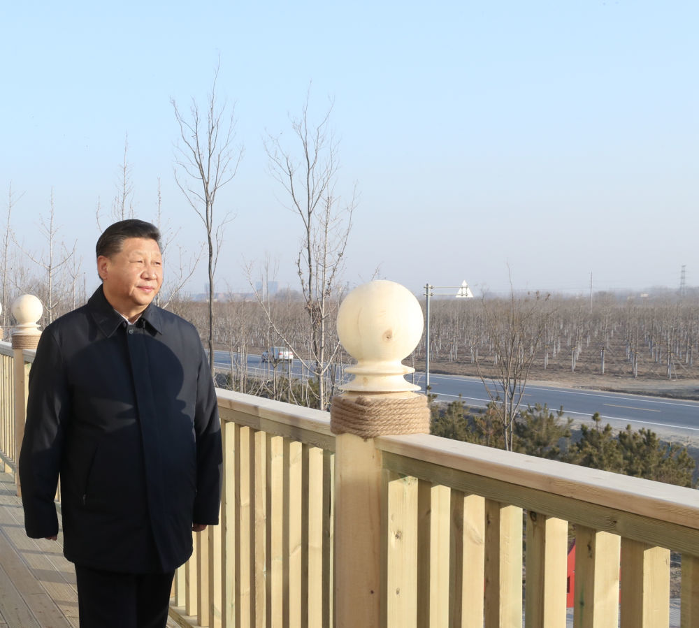 2019年1月16日,在河北省雄安新区“千年秀林”大清河片林一区造林区域,习近平登上秀林驿站二层平台远眺林区全貌。