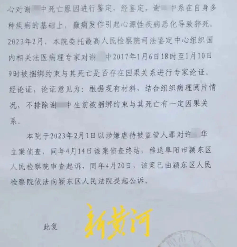 答复函中还称,该院委托最高人民检察院司法鉴定中心组织国内相关法医病理专家对谢某中2017年1月6日18时至1月10日9时被捆绑约束与其死亡是否存在因果关系进行专家论证。论证意见为:根据现有材料,结合组织病理阅片情况,不排除谢某中生前被捆绑约束与其死亡有一定因果关系。随后,阜阳市颍东区人民检察院对许某华提起了公诉。