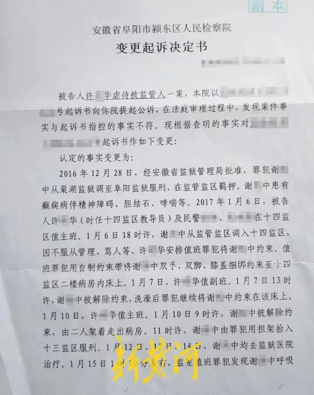 阜阳市颍东区人民法院的刑事判决书显示,2017年1月6日,许某华安排值班罪犯对谢某中进行约束。值班罪犯用自制约束带将谢某中双手、双脚、膝盖捆绑约束至十四监区二楼病房内床上。1月7日谢某中曾被短暂解除约束,但在洗澡后却被继续约束在原来的病床上,一直到1月10日许某华值主班。当日9时许,谢某中被解除约束,后被两人搀扶至卫生间洗澡。11时许,谢某中由其他罪犯用担架抬入第十三监区服刑。1月12日、13日、14日,谢某中因病去监狱医院治疗。1月15日1时10分左右,监室值班罪犯发现谢某中呼吸困难、抽搐,随后用担架将谢某中送至监狱医院进行抢救,2时许由120急救车转送阜阳市第二人民医院救治,2时50分许阜阳市第二人民医院宣布谢某中临床死亡。