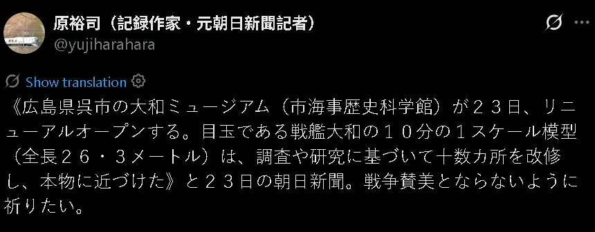 在高市早苗政府加速日本再军事化的当下,大和博物馆的重开引起不少有良知的日本网民的担忧。一位曾供职于日本《朝日新闻》的作家就担心博物馆的重开会被视为“赞美战争”。