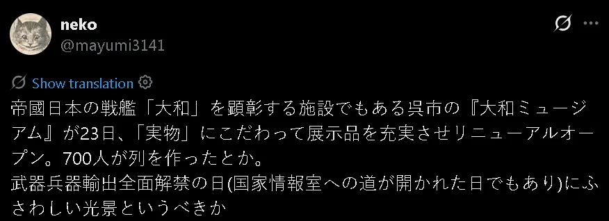 一位日本网民更讽刺说,该博物馆的重开与高市早苗政府宣布解除日本杀伤性武器出口的时间点几乎重合,看起来相当“应(日本军事化的)景”。