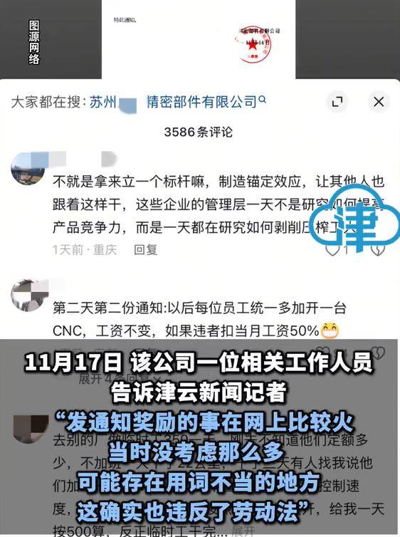 近日,苏州某企业一名员工“连续工作一天一夜”并获得公司公开奖励一事,在舆论场中掀起波澜。该公司发布内部《奖励通知》,称CNC车床员工孙某在项目交期紧张期间,主动请示连轴工作,“从当天白班连夜班”,同时操作两台机床,最终保质保量完成任务。为此,公司决定给予其600元现金奖励,并“呼吁大家向他学习”。此举在社交平台曝光后,迅速引发公众热议。