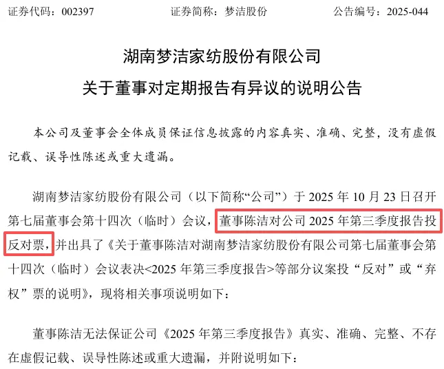 一个月前,陈洁对梦洁股份的三季报投了反对票,认为财务数据失真。