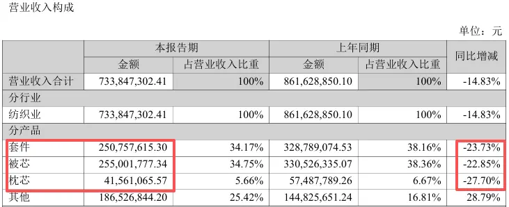 从上半年收入构成来看,梦洁股份的套件、被芯、枕芯收入都是下滑的。