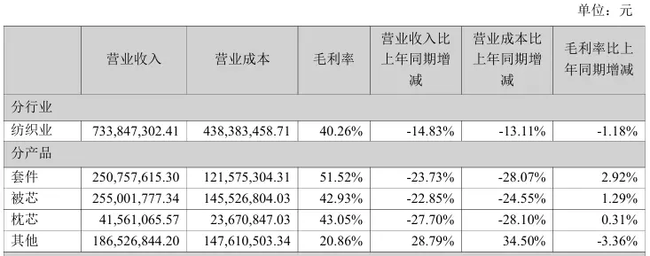 而套件、被芯、枕芯的毛利率均达到51%、43%、43%。