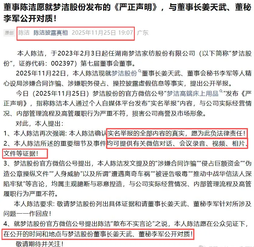 针对梦洁股份的最新声明,陈洁在其公众号上进一步驳斥: