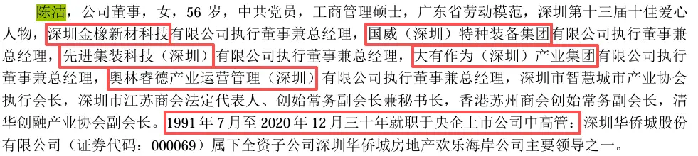 在此之前,陈洁曾在深圳多个公司当总经理,并且她还曾是华侨城欢乐海岸公司的中高管。