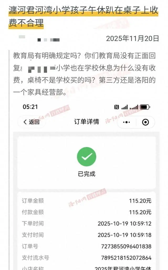 近日,网友反映,河南洛阳一小学孩子午休趴桌子上要收费,桌椅是学校的,认为收费不合理。相关截图显示,支付费用115元。此前也有网友反映,该校收取午休桌椅费,一学期115元。