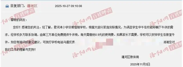 午休椅收费终止了吗?退费后,这些椅子怎么处置?是否变为免费用?11月26日,潇湘晨报记者多次致电该校,电话均未接通。随后,记者致电瀍河区教体局,工作人员表示,辖区学校没有过类似事情,至于对他们网友的回复,会去了解情况。