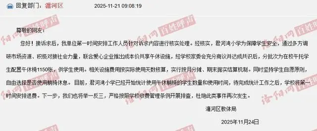 该回复称,学生自由选择是否使用躺椅,目前学校正在统计使用情况,完成统计后将第一时间退费。下一步他们将严格排查,杜绝此类事件再次发生。值得注意的是,瀍河区教体局此前也回复过此事:午休椅由第三方单位免费提供,每天需缴纳0.9元使用费。
