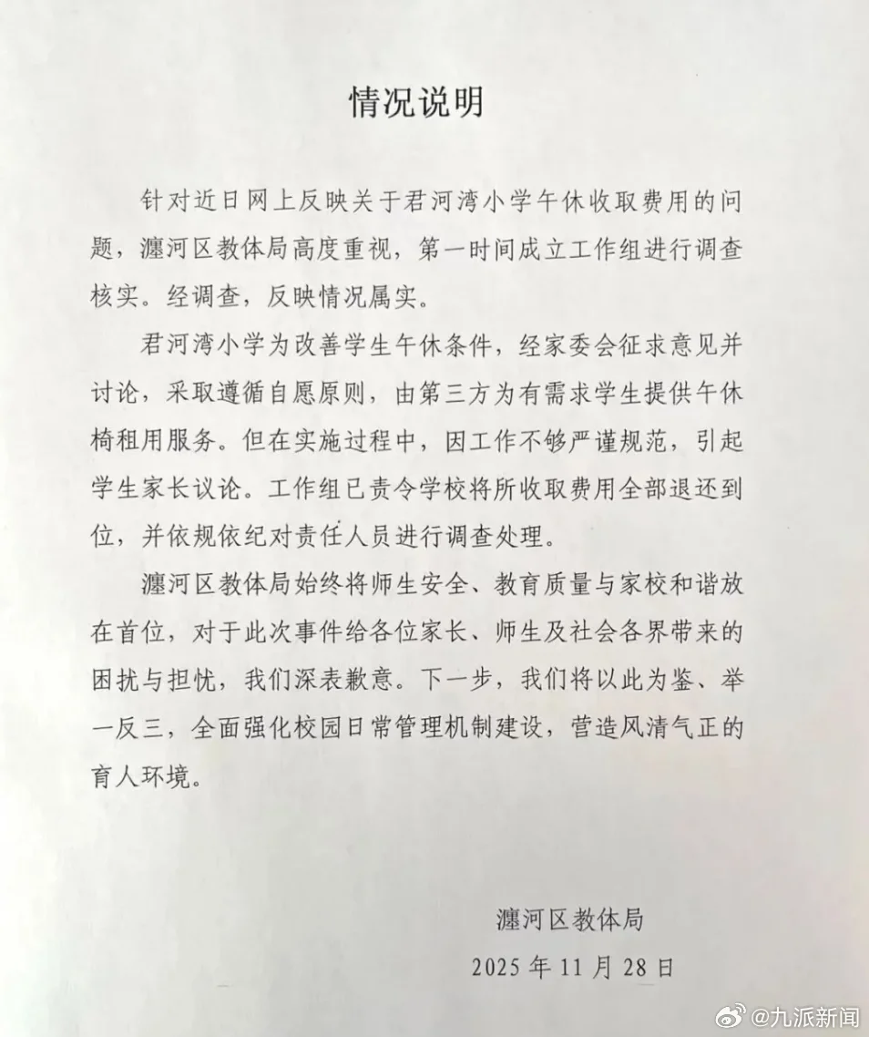 洛阳市瀍河区教体局发布情况说明:针对近日网上反映关于君河湾小学午休收取费用的问题,瀍河区教体局高度重视,第一时间成立工作组进行调查核实。经调查,反映情况属实。