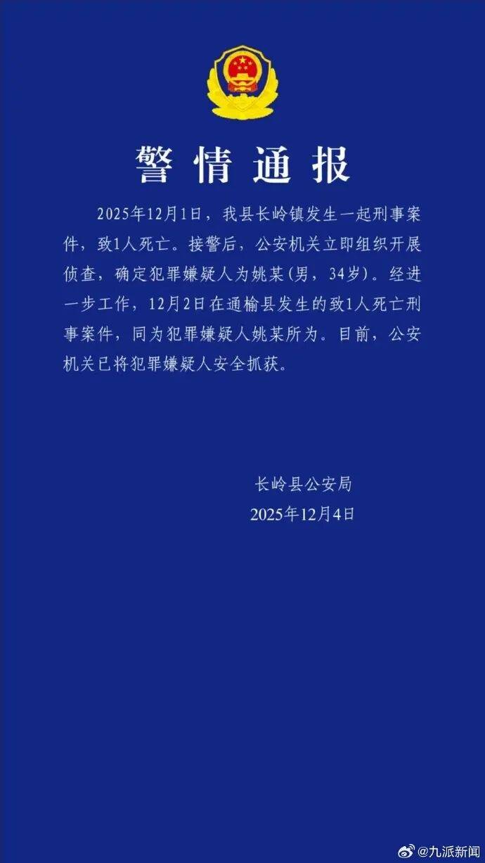 2025年12月1日,我县长岭镇发生一起刑事案件,致1人死亡。