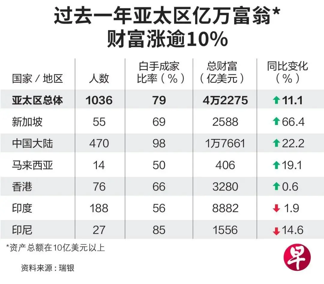 亚太区迎来显著回升,亿万富豪人数从981人增至1036人,增幅居全球之首。该区总财富增长11.1%至4.2万亿美元,其中79%为白手兴家,领先所有地区。