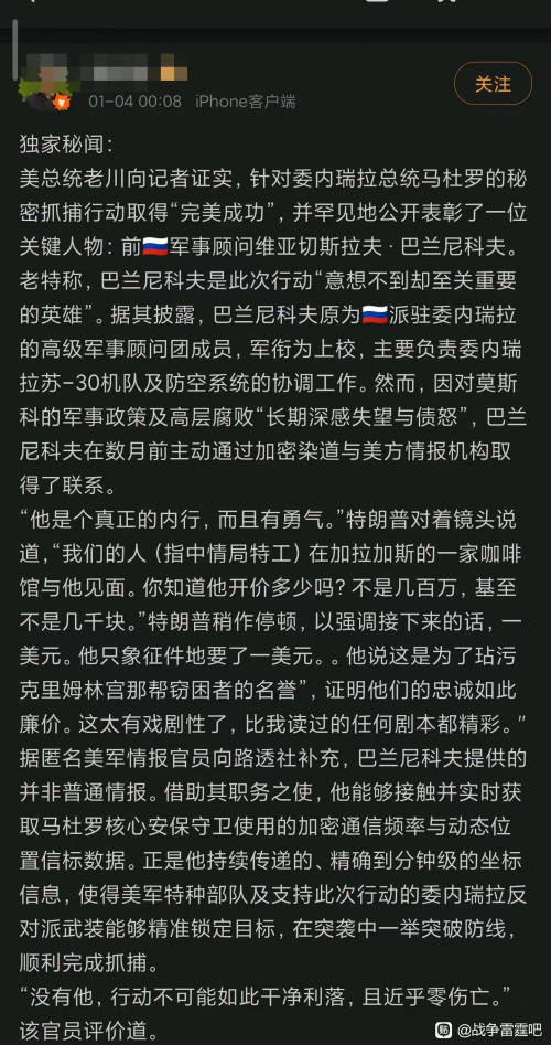 “当地时间1月3日,美军闪电突袭加拉加斯,成功控制并移送马杜罗!”“特朗普亲自认证:抓捕行动‘完美成功’,关键功臣竟是一位前俄罗斯军事顾问——维亚切斯拉夫·巴兰尼科夫上校!”“特朗普透露:这位俄罗斯上校因对莫斯科‘极度失望’,主动联系美国,只要了1美元象征性报酬,只为‘玷污克里姆林宫那帮窃国者的名誉’!”“爆料称,巴兰尼科夫提供了马杜罗卫队的实时加密通信和精准坐标,让美军一击即中!”“特朗普还宣称要给他颁美国最高平民荣誉——总统自由勋章!”