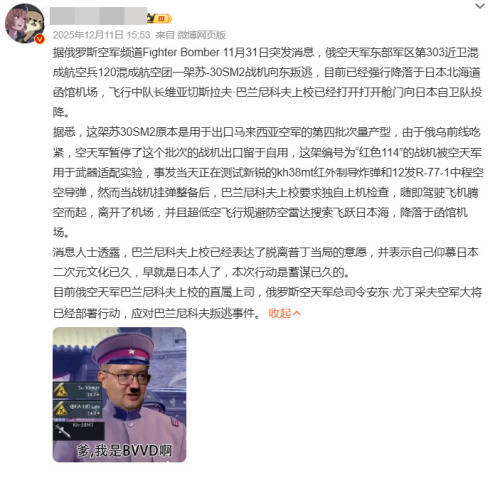 前不久《战争雷霆》更新,把俄制苏-30MKM战机做得强到离谱,还居然把它塞进了日本科技线。这一波操作直接惹怒了大量中国玩家。于是,一个“俄罗斯飞行员巴兰尼科夫叛逃日本”的梗图就开始疯传。