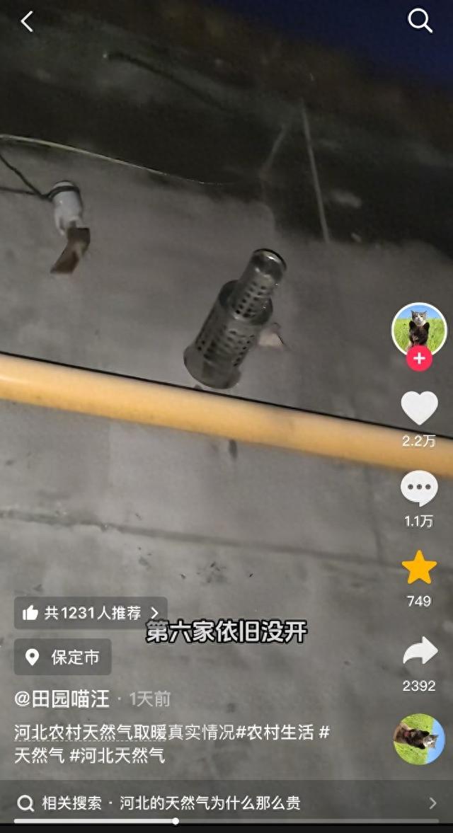 IP属地显示河北省保定市的抖音平台博主@田园喵汪 拍摄视频称,他所在村庄大部分家庭未使用天然气。他说,即使将壁挂炉开到60多摄氏度,室内温度也不会超过13摄氏度,而当地天然气价格为3.16元/立方米。
