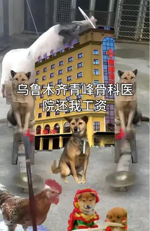 其中,有狗、鸡、猪等花式杂耍的画面,配上喜庆快节奏的音乐,插入青峰骨科医院的照片,配文“还我工资”;有戴礼帽、眼镜企鹅跳舞,过程中闪出青峰骨科医院照片的视频,配文“还我工资”;有视频套用经典电影画面,配文“还我工资”;有多人敲年糕,石缸里插入青峰骨科医院照片的视频等。