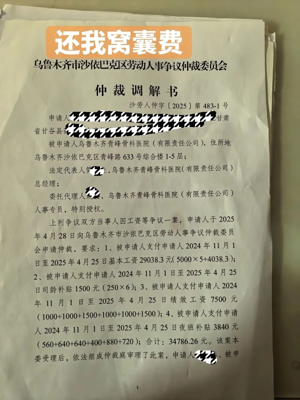 根据该女子晒出的一份2025年6月3日的《仲裁调解书》显示,申请人要求,青峰骨科医院支付2024年11月1日至2025年4月25日基本工资29038.3元、司龄补贴1500元、绩效工资7500元、夜班补贴3840元。