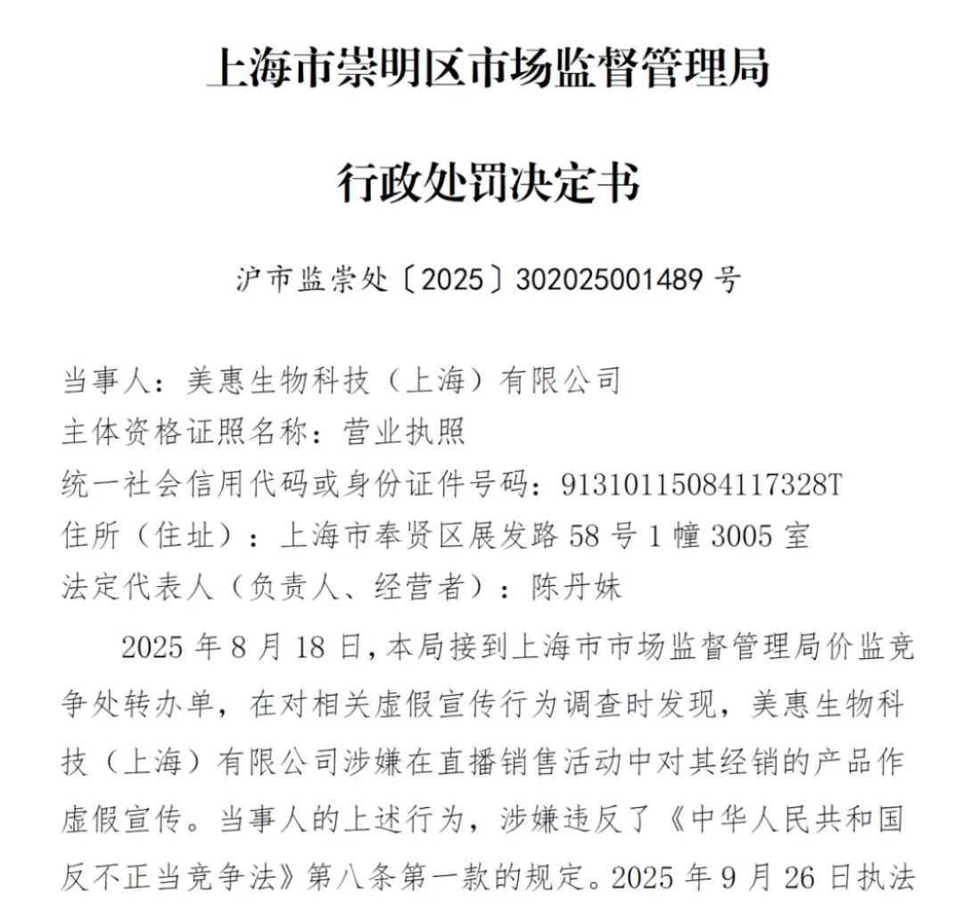 凤凰网《风暴眼》获悉,日前,美惠生物科技(上海)有限公司(下称“美惠生物”),因在直播带货中对所经销的菌小宝“太空30号”产品进行虚假功效宣传,被上海市崇明区市场监督管理局立案调查,最终依法处以3万元罚款。