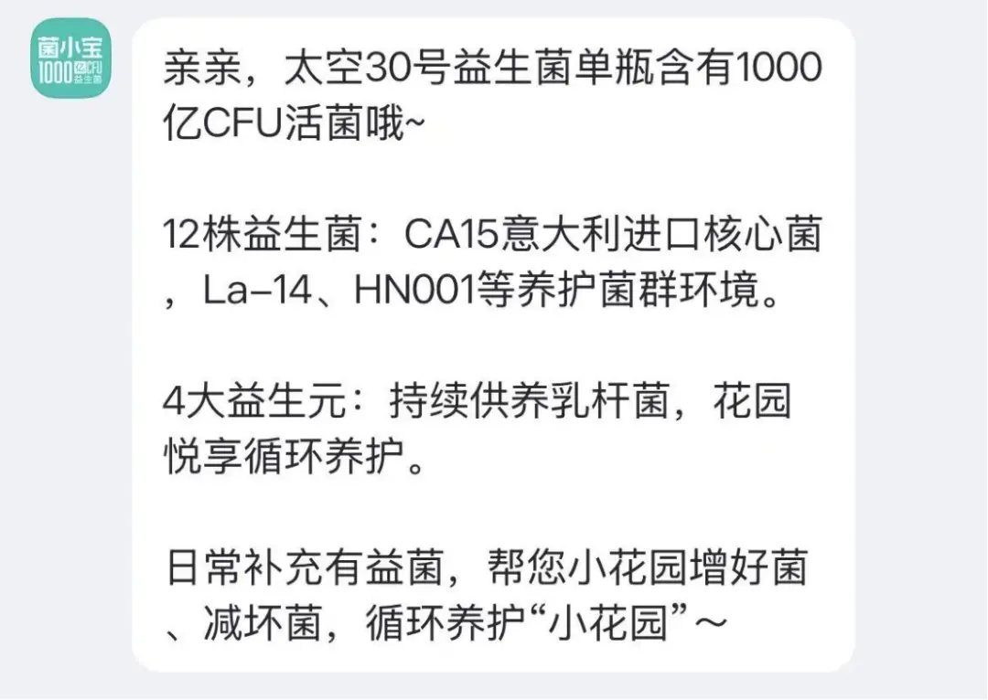 但耐人寻味的是,在菌小宝抖音官方旗舰店的客服对话页,自动弹出的常见问题里,仍包含“30号怎么吃”“适合人群”“产品介绍”等相关条目。