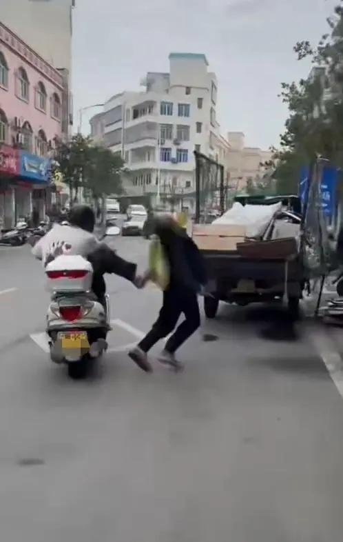 2月12日,网曝广东茂名高州市石鼓镇一银行门口,一男子骑着摩托车,一脚将拾荒老人踹倒。