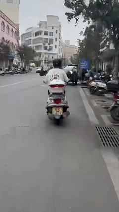摩托车后面一直有人跟拍,视频里能看到用脚踹和摩托车驶离的过程,还有拍摄者发出的笑声。