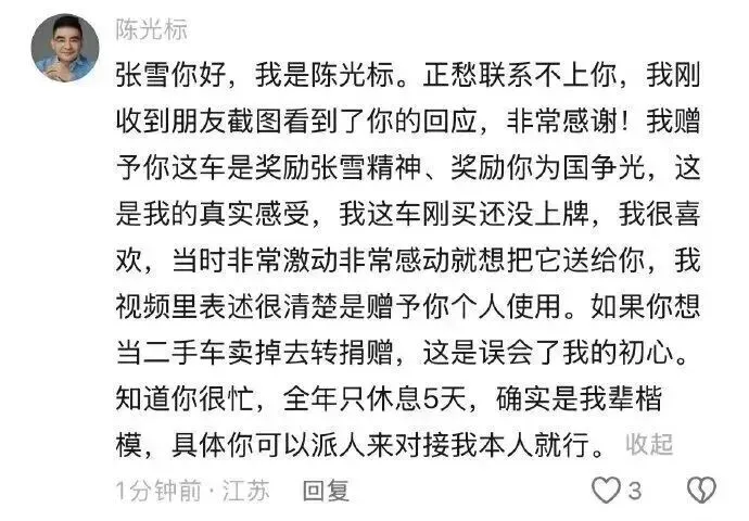 张雪你好,刚收到朋友截图看到了你的回应,非常感谢!我赠予这车是尊敬张雪精神、尊敬你为国争光,这是我的真实感受。这车还没上牌,我第一眼就很喜欢,当时非常激动,就想把它送给你本人使用。如果你想把它当二手车卖掉去转赠,这也是好事,我支持。你我都很忙,具体我们俩私信对接就行。车的事就这么定,等你消息。
