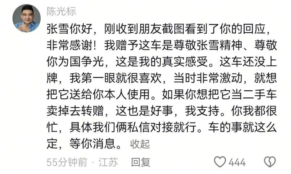 今天中午,陈光标在张雪的社交平台评论区留言。