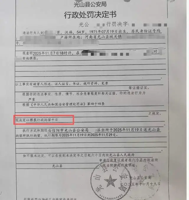 11月19日,光山县公安局以猥亵对刘某处以行政拘留10日的处罚。