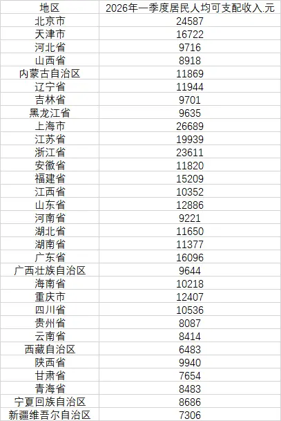 31个省份2026年第一季度居民人均可支配收入(数据来源:国家统计局)