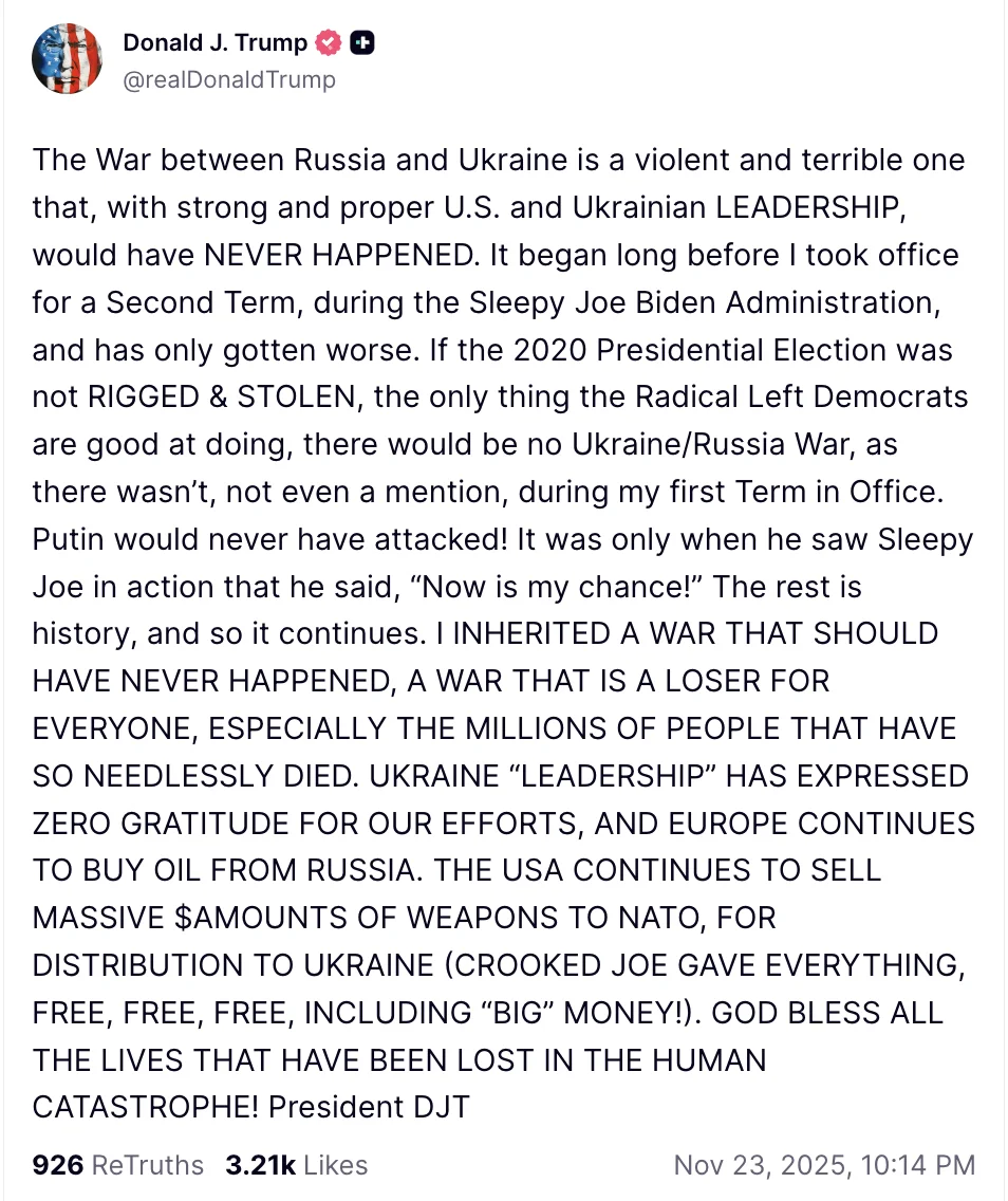 特朗普在社交平台发文表示:“乌克兰‘领导层’对我们的努力毫无感激,而欧洲仍在购买俄罗斯的石油。”