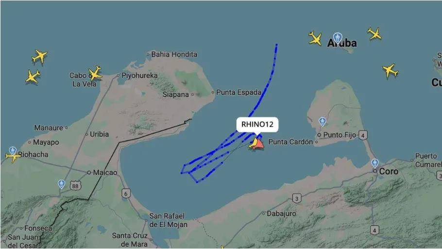 FlightRadar24等网站显示,美国战斗机留下的飞行轨迹表明,它们在委西北部的马拉开波湖北部上空飞行,飞越委内瑞拉湾水域,飞行路线位于委内瑞拉两个能源产业关键地区——苏利亚州的拉瓜希拉市和法尔孔州首府科罗市之间。