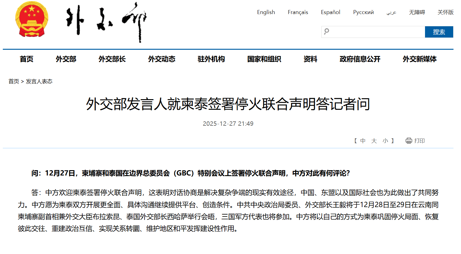 外交部网站12月27日消息,外交部发言人就柬泰签署停火联合声明答记者问。