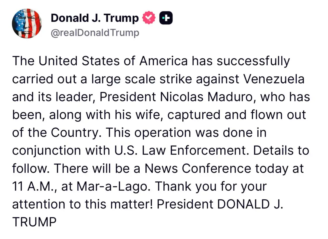 特朗普称,美国已成功对委内瑞拉及其领导人马杜罗总统实施了大规模打击,马杜罗及其妻子已被抓获并乘飞机离开该国。此次行动是与美国执法部门联合进行的。后续细节将陆续公布。当地时间1月3日上午11点,将在海湖庄园举行新闻发布会。