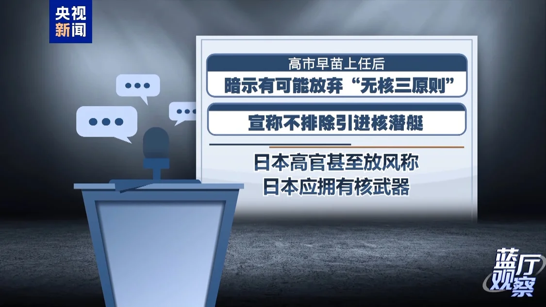 但近年来日本不断寻求强化延伸威慑安全承诺,甚至谋求实现核共享。高市早苗上任后更暗示有可能放弃“无核三原则”,宣称不排除引进核潜艇,日本高官甚至放风称日本应拥有核武器。