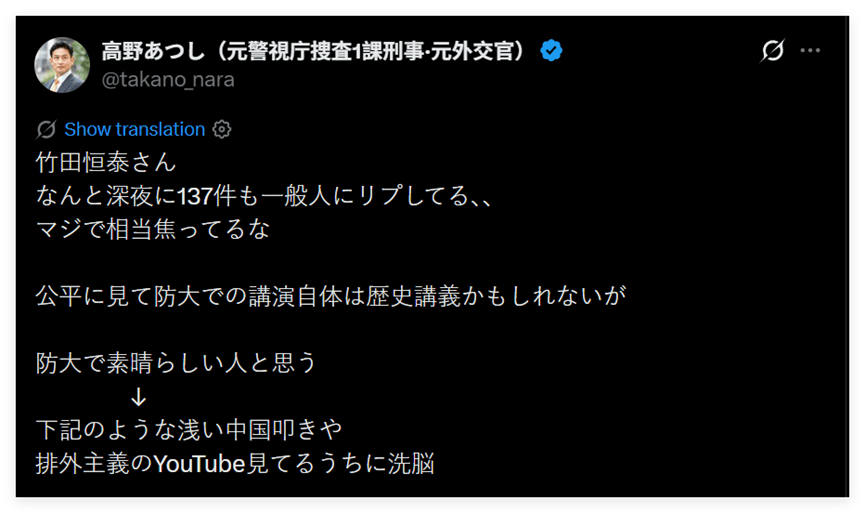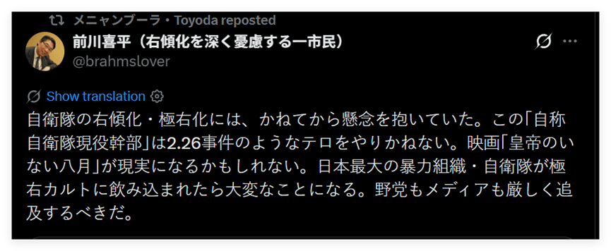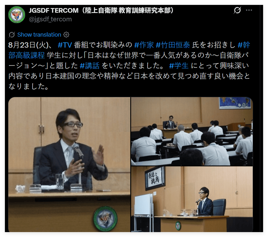 还有日本网民指出,过去这些年日本自卫队正在发生一些让人极为担忧的变化,比如他们曾多次邀请在历史问题和涉华议题上发表过极端言论的日本极右翼分子,去给自卫队的自卫官“上课”——比如一个名叫竹田恒泰的日本极右翼分子。
